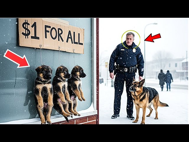 An einem schwülen Nachmittag, als die Sonne unbarmherzig vom Himmel brannte, bemerkte Officer Wagner aus dem Augenwinkel eine seltsame Ansammlung an einer Straßenecke. Ein heruntergekommener Mann stand neben einem handgemalten Schild, auf dem in krakeliger Schrift stand: „Welpen zu verkaufen – 1 $.“ Doch es war nicht das Schild, das Wagner erschaudern ließ. Es war die Art und Weise, wie die „Ware“ präsentiert wurde: Drei winzige, kaum atmende Welpen hingen in einem groben Netzbeutel an einem rostigen Haken, der an einem Laternenpfahl befestigt war. Ihre kleinen Körper zuckten schwach, ihre Augen waren fast geschlossen, und ihre leisen, jämmerlichen Schreie waren kaum mehr als ein Flüstern im Lärm des vorbeifahrenden Verkehrs.