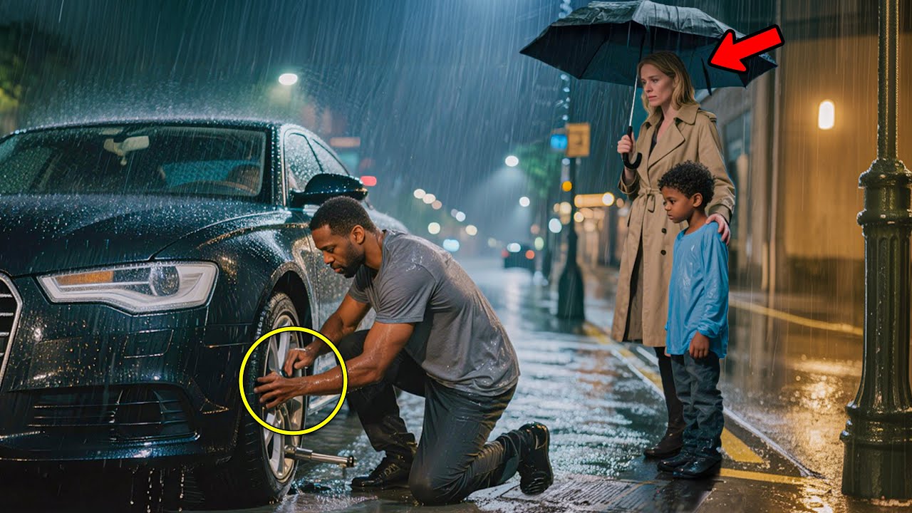Eine Luxuslimousine stand am Straßenrand, die Warnblinkanlage blinkte schwach im strömenden Regen. Eine Frau stand daneben. Ihr Handy drückte sie verzweifelt ans Ohr. Selbst aus der Ferne, selbst durch den Regen hindurch, konnte James die Frustration und Verzweiflung in ihrer Stimme hören. „Ich warte schon über eine Stunde. Sie sagten 30 Minuten.“ Die Stimme der Frau brach vor Rührung. „Nein, ich kann nicht noch zwei bis drei Stunden warten. Meine Mutter hatte einen weiteren Schlaganfall. Sie sagten, ich solle sofort kommen, wenn ich möchte.“ Ihre Stimme versagte völlig. „Bitte, gibt es denn niemanden näher?“ James sah ihr nach, wie sie auflegte. Ihre Schultern sanken vor tiefer Verzweiflung, die selbst durch den Regen sichtbar war. Sie versuchte es mit anderen Nummern, ihre Finger zitterten, während sie durch ihr Handy scrollte. Taxiunternehmen, Mitfahr-Apps – jeder Anruf endete gleich. Bei diesem Wolkenbruch in diesem Stadtteil wollte niemand kommen. James’ Schritte wurden langsamer, obwohl sein Verstand ihm zuschrie, weiterzugehen. Jeder Instinkt riet ihm, sich zu bewegen. Es war schon gefährlich knapp, und Mr. Marco hatte unmissverständlich klargemacht, dass eine weitere Verspätung die Kündigung bedeuten würde. Keine zweite Chance, keine Ausreden. Doch als er die Frau sah, die Panik in ihrem Gesicht, wie ihre Hände zitterten, als sie eine weitere Nummer wählte, konnte er nicht einfach vorbeigehen. James kniete sich zu Michael hinunter, der Regen prasselte auf beide herab. „Kumpel, die Frau braucht Hilfe. Ihr Auto ist kaputt, und ihre Mutter liegt schwer krank im Krankenhaus.“ Michaels Augen füllten sich mit einem Verständnis, das weit über seine acht Jahre hinausging. „Wir sollten ihr helfen, Papa. Wie du immer sagst: Anderen zu helfen ist das Wichtigste, was wir tun können.“ James stand auf, die Kiefer entschlossen angespannt. „Du hast recht, mein Junge. Absolut. Bleib hier unter dem Vordach bei unseren Sachen. Ich bin gleich wieder da.“ Vorsichtig näherte er sich der Frau, der Regen setzte sofort ein und durchnässte seine Schultern. „Gnädige Frau, brauchen Sie Hilfe?“ Sie wirbelte herum, und James sah es: den flüchtigen Anflug von Angst in ihren Augen. Ein Fremder, der sich im Dunkeln, im Regen, in dieser Gegend näherte. Doch die Verzweiflung verdrängte schnell den Verdacht. „Mein Reifen ist platt.“ Ihre Worte sprudelten nur so aus ihr heraus.